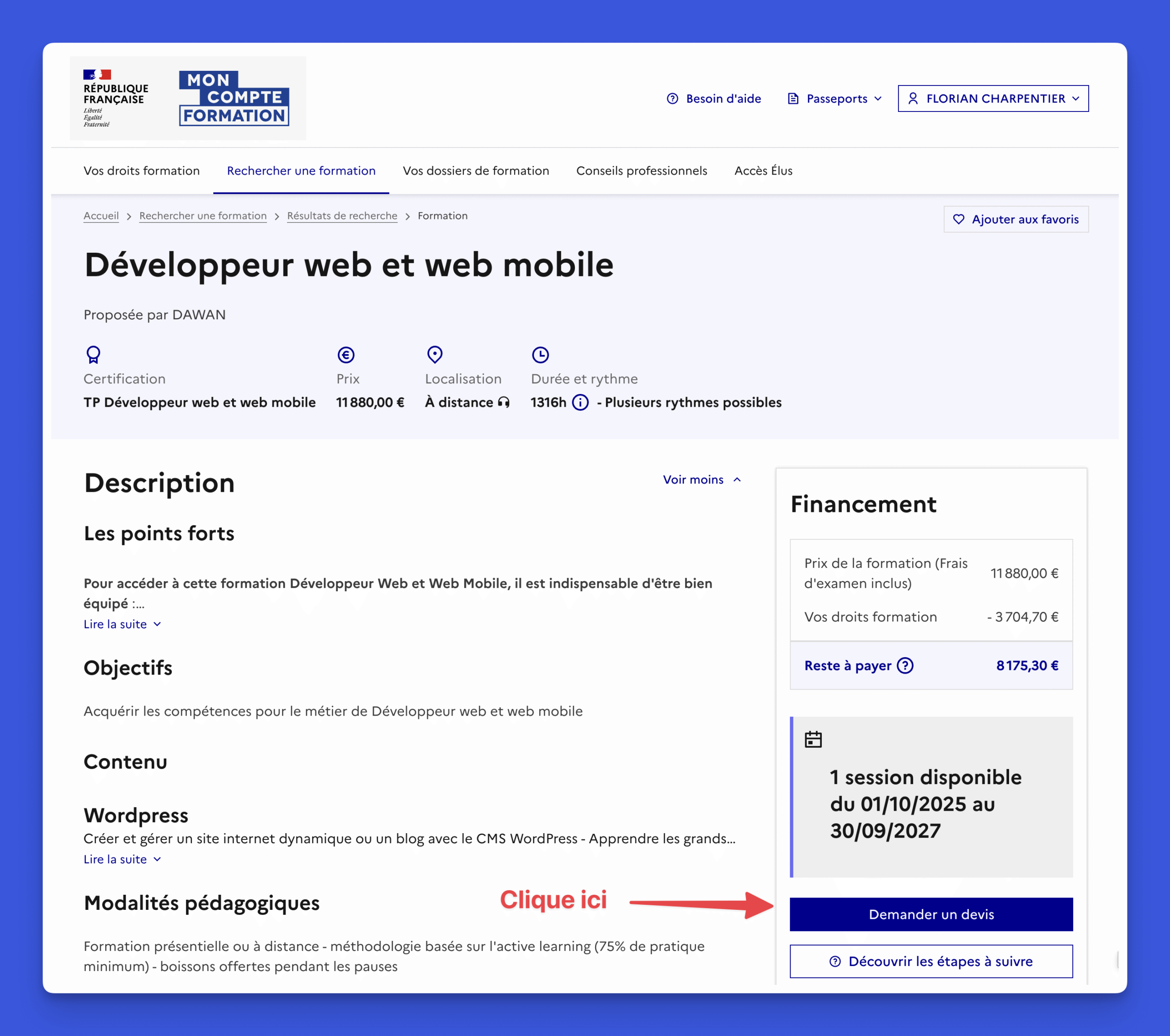 - Formation WordPress en 5 jours (250 €) → Compétences → Le CPF refuse.